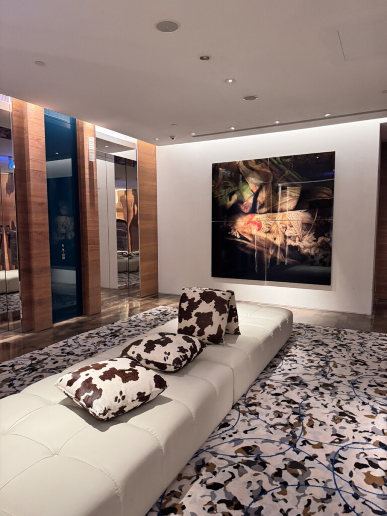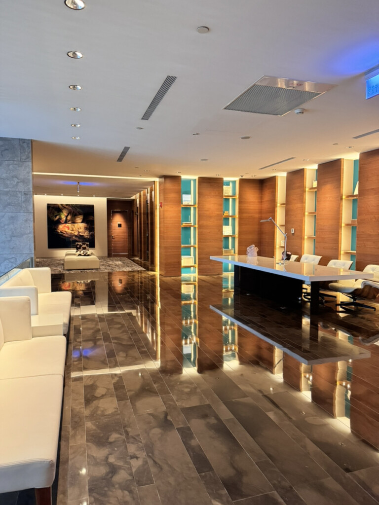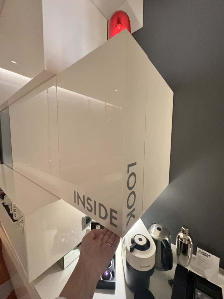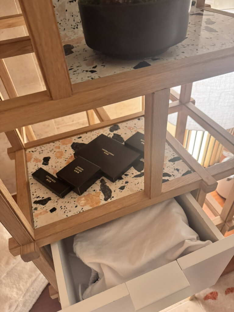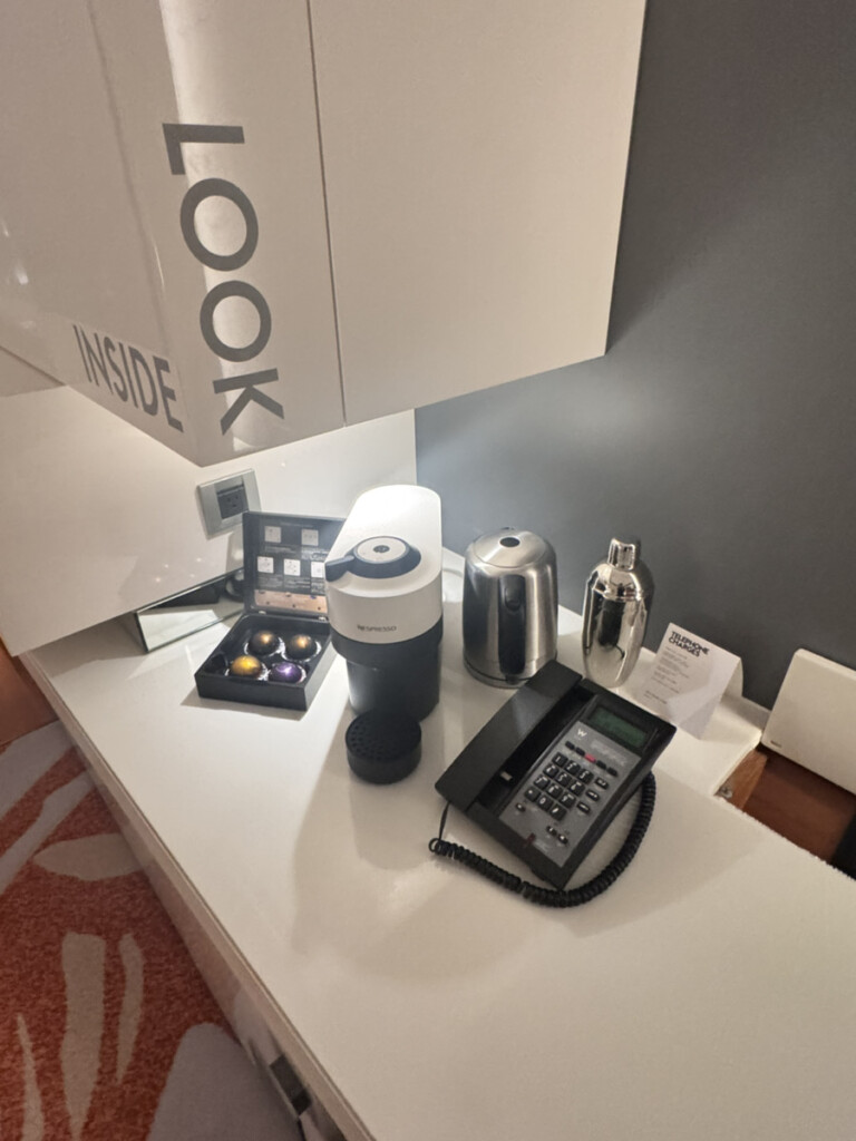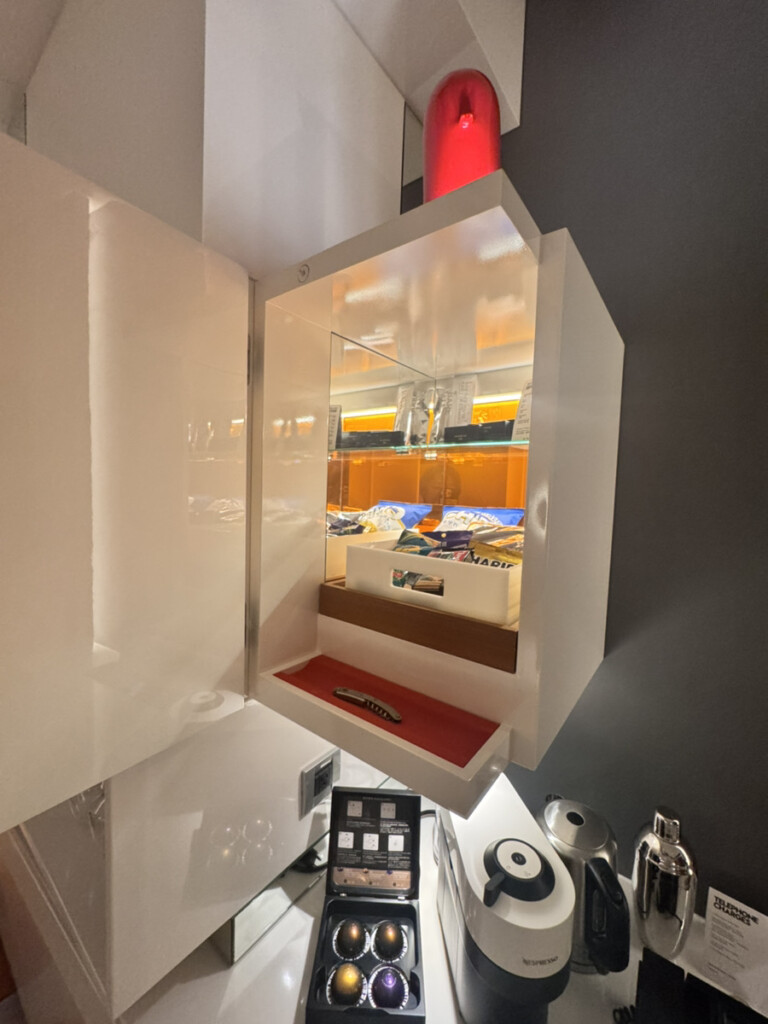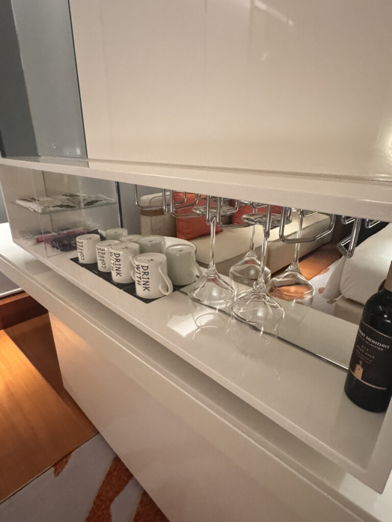 バーカウンター(アメニティスペース)はWホテルらしいスタイリッシュさで、グラスが綺麗に吊り下がっていて一気に気分が上がる。ただしオシャレすぎて、最初に歯ブラシどこ!?問題が発生(笑)。