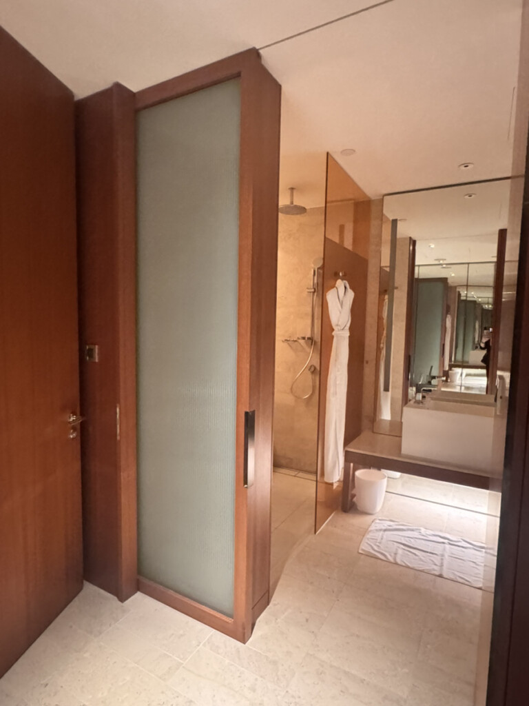 もちろん無防備という意味ではなく、バスルーム・クローク・パウダールームを“ひとつの大きなゾーンとして仕切る”デザインになっていて、お風呂そのものにはドアをつけないスタイル。